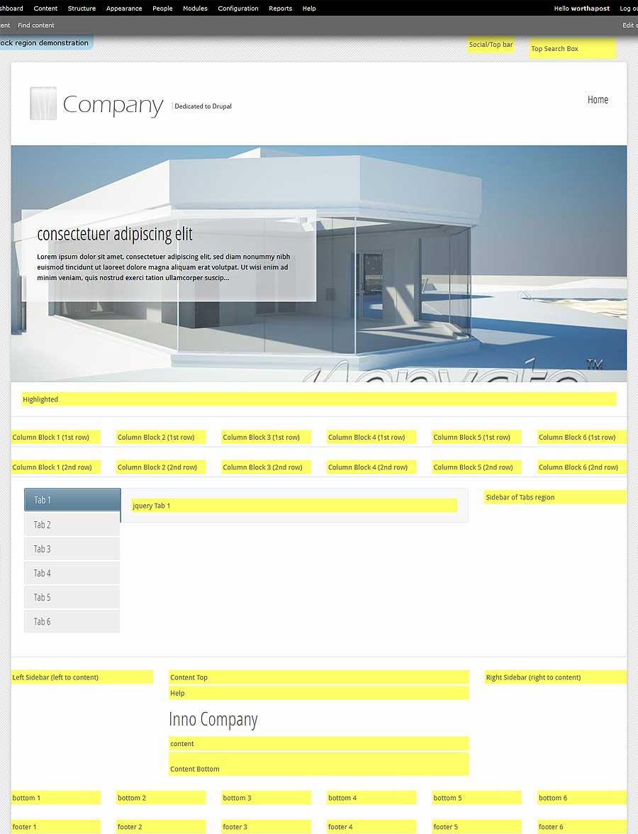 You also have jQuery tabs block region. Which ever block you want to add into jQuery tabs, you can add them to jquery tabs regions on block management page. To change tabs name, you should visit InnoCompany theme settings page.